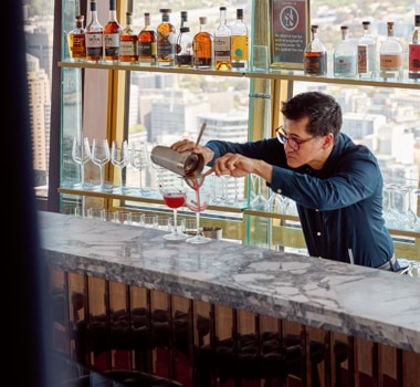 Originally unveiled in 1968, Sydney Tower’s revolving deck has been home to numerous restaurants over its lifespan, from The Summit to O Bar and Dining, 360 Bar and Dining, and even an earlier incarnation of Infinity under Mike Dierlinger. Not having ever been designed to host a full-sized commercial kitchen necessarily limited the venue’s possibilities. “Most people’s culinary experience of the building has been as a buffet. So it’s never really been considered a serious destination.”